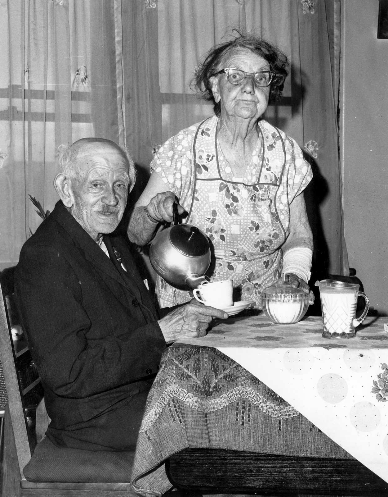 Mrs Jessie Weatherall poured a cup of tea for Mr Broom at his home after his divorce petition was dismissed yesterday, Herald & Weekly Times Limited portrait collection. This work is in copyright; H38849/4822