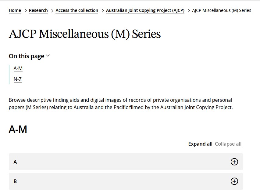 The Miscellaneous (M) series consists chiefly of private records relating to Australia, New Zealand and the Pacific held in the British Library, the National Libraries of Wales, Scotland and Ireland, university libraries, county record offices, museums, religious archives, learned societies and private homes. You can browse the list of finding aids from private organisation, personal and UK County Record Office records from the AJCP portal. The M Series also includes some official records from the Hydrographic Office, Post Office and the Ministry of Defence.